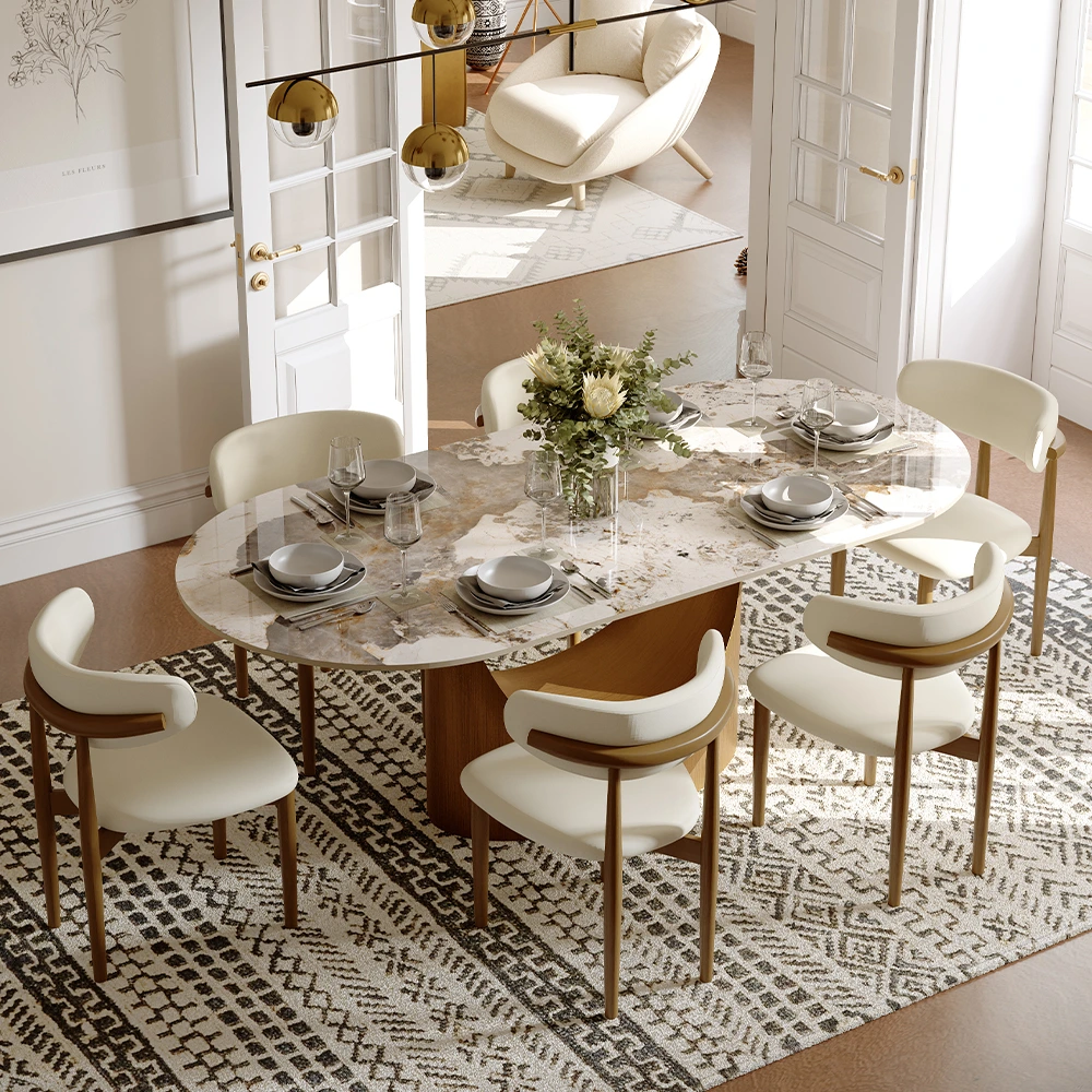 For smaller UK homes, consider an oval or round marble table to save space. Pair it with slim-leg chairs to create an open, airy feel.